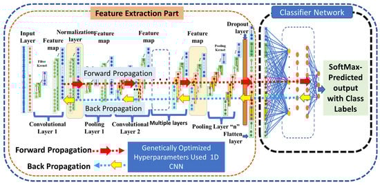 The CNN hyperparameters, including the dropout layer in the final feature-extraction layer [29], have been genetically optimised to maximise the performance of 1D-CNN, as shown in Figure 5. The 1D-CNN design consists of 5 convolutional layers, 2 hidden layers, and a sigmoid classifier.
