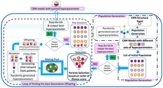 Figure 5 illustrates how GA optimisation creates 1D-CNN populations using randomly generated hyperparameters. After that, accuracy is computed for every output forecast, and the population record is arranged from high to low based on fitness value. To maintain population diversity and enhance the genetic algorithm’s convergence with newly hyperparameterised settings that have been fitness-tested, randomly generated hyperparameters have been introduced to facilitate mutation and the creation of new offspring. The genetic algorithm stops when the forecasted accuracy equals the fitness score of the new offspring and provides the optimised 1D-CNN hyperparameters. The genetic algorithm terminates generation and preserves the hyperparameters if the fitness score is at a maximum; otherwise, evolution continues until convergence. Figure 3a,b show how optimised hyperparameters are used in the second and third phases of the proposed methodology to maximise prediction accuracy.