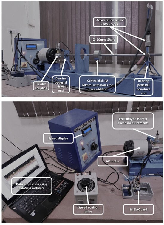 The experimental setup is shown in Figure 6. The rotor rig experimental setup comprises the rotor assembly, which is equipped with a motor speed controller and a drive motor. The rotor assembly has acceleration and vibration sensors designed to monitor vibration. The experimental setup comprises a motor with a power of 1/6 hp and a rotor system consisting of a shaft with a 10 mm diameter, a disc installed in the middle, and ball bearings 500 mm apart supporting the shaft’s ends. Accelerometers that record data are mounted on the bearing housing, and the flexible coupling is used to connect the motor and shaft. The disc has four holes spaced at right angles to each other. An acceleration sensor with a sensitivity of 100 mV/g is used to collect the vibration time waveform, which is then processed with the NI data card 9230. A 50 kHz vibration time waveform is recorded for two seconds, and many vibration time waveform signals are recorded at 1500 RPM, 1750 RPM, and 2000 RPM. The collected data is then divided into 2000 data points per sample.