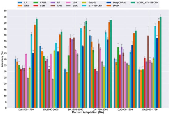 Test results of MTH-1D-CNN, which is a 1D-CNN with manually tuned hyperparameters, indicate a 67.5% accuracy prediction for domain adaptation tasks of DA 2000-1750 (source training data collected at 2000 RPM, tested on target data collected at 1750 RPM). Test results indicate that MTH-1D-CNN performs better than traditional domain adaptation algorithms (JDA, BDA, EasyTL) in terms of prediction performance; however, it is found that DANN and ADDA outperform the manually tuned 1D CNN (MTH-1D-CNN) in the DA task. Furthermore, ADDA_MTH-1D-CNN, which is ADDA within its architecture with a 1D-CNN and manually tuned hyperparameters, outperforms MTH-1D-CNN and DANN, achieving a maximum prediction accuracy of 75%. The test results show that ADDA increases prediction accuracy by addressing the ‘domain shift’ problem. However, addressing concerns about 1D-CNN performance, such as hyperparameter tuning and overfitting, may improve ADDA’s prediction performance, which is a crucial research need. Additionally, ADDA’s performance compared to JDA, BDA, EasyTL, DeepCORAl, and DANN demonstrates that ADDA’s adversarial GAN-loss-based domain adaptation outperforms statistical distribution, non-parametric domain adaptation, and other domain-invariant feature-based learning methods.