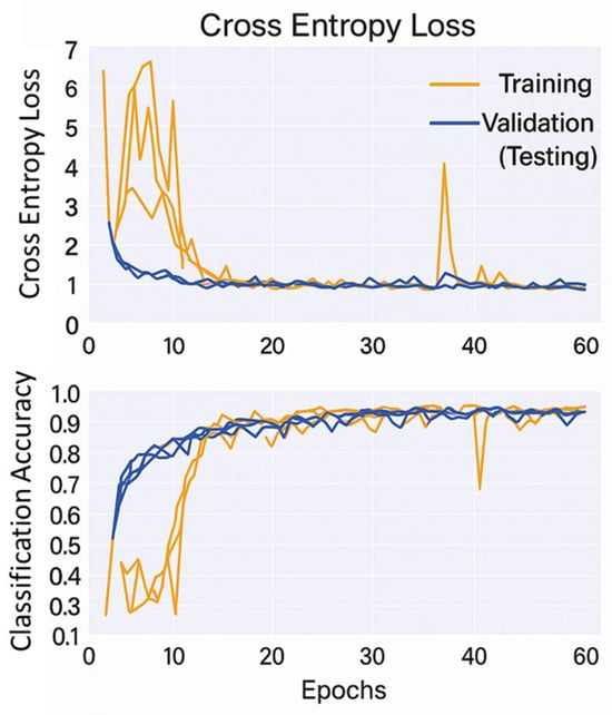 The primary objective is to attain a maximum level of classification accuracy in this phase. Optimising hyperparameters using genetic algorithms is crucial for achieving the most accurate predictions with 1D-CNN. Furthermore, CNN’s overfitting concerns are effectively addressed by positioning dropout as the last layer of the CNN architecture. The research outcome of GA optimisation has been implemented in the CNN architecture, and the source encoder has been pre-trained. The pre-trained model undergoes k-fold validation, and the test results are shown in Figure 9. Five-fold cross-validation with 61 epochs ensures that the cross-entropy loss decreases and classification accuracy increases with each epoch.
