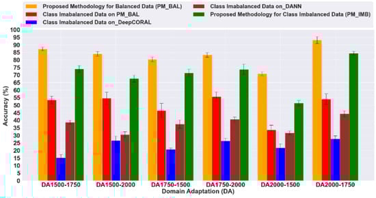 The test results are verified using the F1-Score metric, specifically designed for use with class-imbalanced data. Table 5 presents the test results for F1-Score, recall, precision, and accuracy across various domain adaptation tasks. This F1-Score, being a harmonic mean, considers both precision and recall in its calculation. Table 5 shows Study 3 test results, indicating that the proposed methodology for ‘class imbalanced data’ achieves the highest F1-Score for the domain adaptation task of 2000 RPM to 1750 RPM (DA 2000-1750) and gained the highest prediction. Thus, the proposed methodology outperforms even with ‘data class imbalance’ in machinery fault diagnosis for variable- speed machine operation conditions.