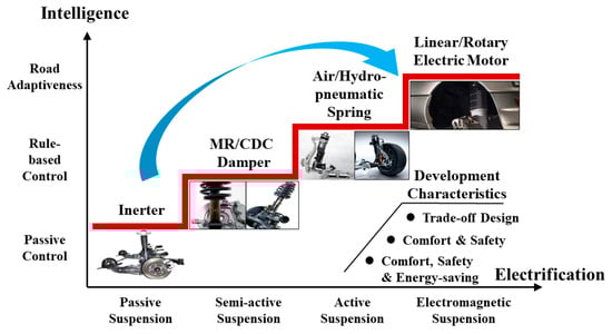 The suspension system serves as the fundamental solution to this conflict and plays a pivotal role in enhancing chassis performance. Employing elastic components (e.g., springs) and dampers, the suspension fulfills three essential functions: shock absorption and vibration damping, ensuring continuous wheel-to-ground contact, and stabilizing the vehicle’s body posture [11,12]. Consequently, the suspension acts as both an intelligent execution unit and a dynamic stabilizer of the chassis, striking a balance between stiffness and compliance. Its effectiveness directly influences the vehicle’s ability to efficiently, smoothly, and safely convert power into controllable motion under complex conditions. This capability significantly affects overall handling, comfort, safety, and operational efficiency. Thus, it constitutes the core subsystem that enables the chassis to achieve its full potential [13,14].