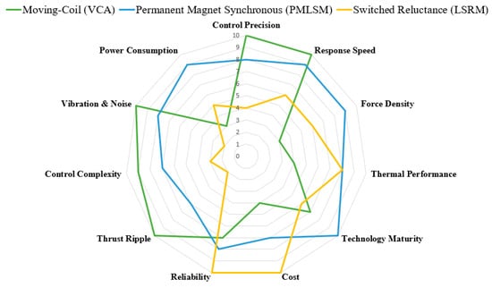 To provide a clearer perspective on the selection of actuator configurations, a comparative summary of the three motor types—focusing on performance, cost implications (specifically rare-earth dependence), and application maturity—is presented in Table 1. This comparison complements the performance radar chart shown in Figure 9.
