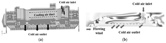 The improved linear motor with an air duct and its cooling airflow diagram: (a) three-dimensional structural schematic of the motor housing; (b) cross-sectional view showing the cooling airflow distribution.