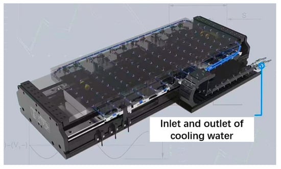 Liquid cooling technology is widely acknowledged as the most effective method for heat dissipation in high-performance electromagnetic suspensions, as shown in Figure 12. Current research emphasizes the structural optimization of cooling channels alongside multi-physics coupling analysis. Rui Xu [64] and Weihua Chen [65], among others, have proposed innovative liquid cooling configurations, including an embedded interleaved dual-channel design and a double-layer spiral structure. Utilizing techniques such as electromagnetic-thermal-fluid multi-physics coupling modeling and multi-objective genetic algorithms, these researchers optimized the geometric parameters of the water channels to achieve a synergistic reduction in both peak motor temperature and temperature non-uniformity. Moreover, research efforts have expanded towards integrated systems. Zhu Jiyuan et al. [66] conceptualized a comprehensive integrated water-cooling solution for a dual-axis linear motor module that encompassed the motor stator, slider, and ball screw, yielding impressive results.