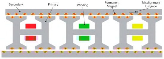 - Wang, X.; Li, G.; Qu, C. Temperature Field Analysis of Primary Permanent Magnet Linear Motor with Magnetic Barrier Coupling. In Proceedings of the 2021 13th International Symposium on Linear Drives for Industry Applications (LDIA), Wuhan, China, 1–3 July 2021; pp. 1–5. [Google Scholar]
