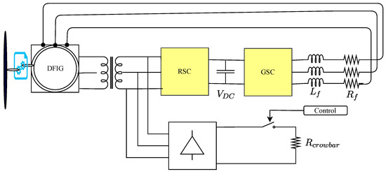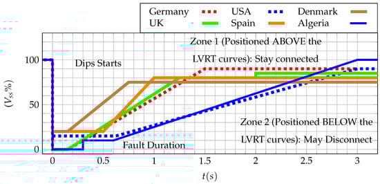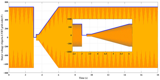 During voltage dips, wind turbines must remain connected to the electrical grid and contribute to voltage stabilization. This study analyzes the impact of voltage dips arising from grid faults on Doubly Fed Induction Generator (DFIG) based Wind Energy Conversion Systems (WECSs). This paper presents a review of the technical regulations for integrating the Algerian electricity grid with the Low Voltage Ride Through (LVRT) system, along with specific requirements for renewable power generation installations. Additionally, the modeling and control strategy of DFIG based WECS has been outlined. Voltage dips can induce excessive currents that threaten the DFIG rotor and may cause harmful peak oscillations in the DC-link voltage, and can lead to turbine speed increase due to the sudden imbalance between the mechanical input torque and the reduced electromagnetic torque. To counter this, a modified vector control and crowbar protection mechanism were integrated. Its role is to mitigate these risks, thereby ensuring the system remains stable and operational through grid faults. The proposed system successfully meets the stringent Algerian LVRT requirements, with voltage dipping to zero for 0.3 s and recovering gradually. Simulations confirm that rotor and stator currents remain within safe limits (peak rotor current at 0.93 , and peak stator current at 1.36 ). The DC-link voltage, despite a transient rise due to the continued power conversion from the rotor-side converter during the grid fault, was effectively stabilized and maintained within safe operating margins (with less than 14% overshoot). This stability was achieved as the crowbar ensured power balance by managing active and reactive power. Notably, the turbine rotor speed demonstrated stability, peaking at 1.28 within mechanical limits.