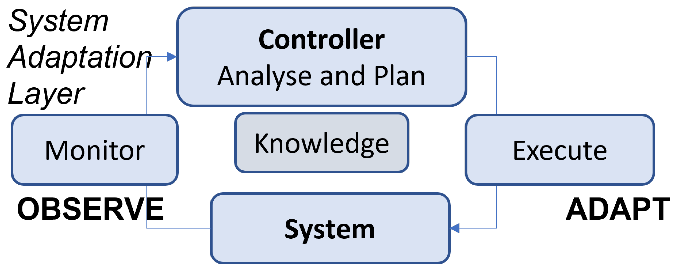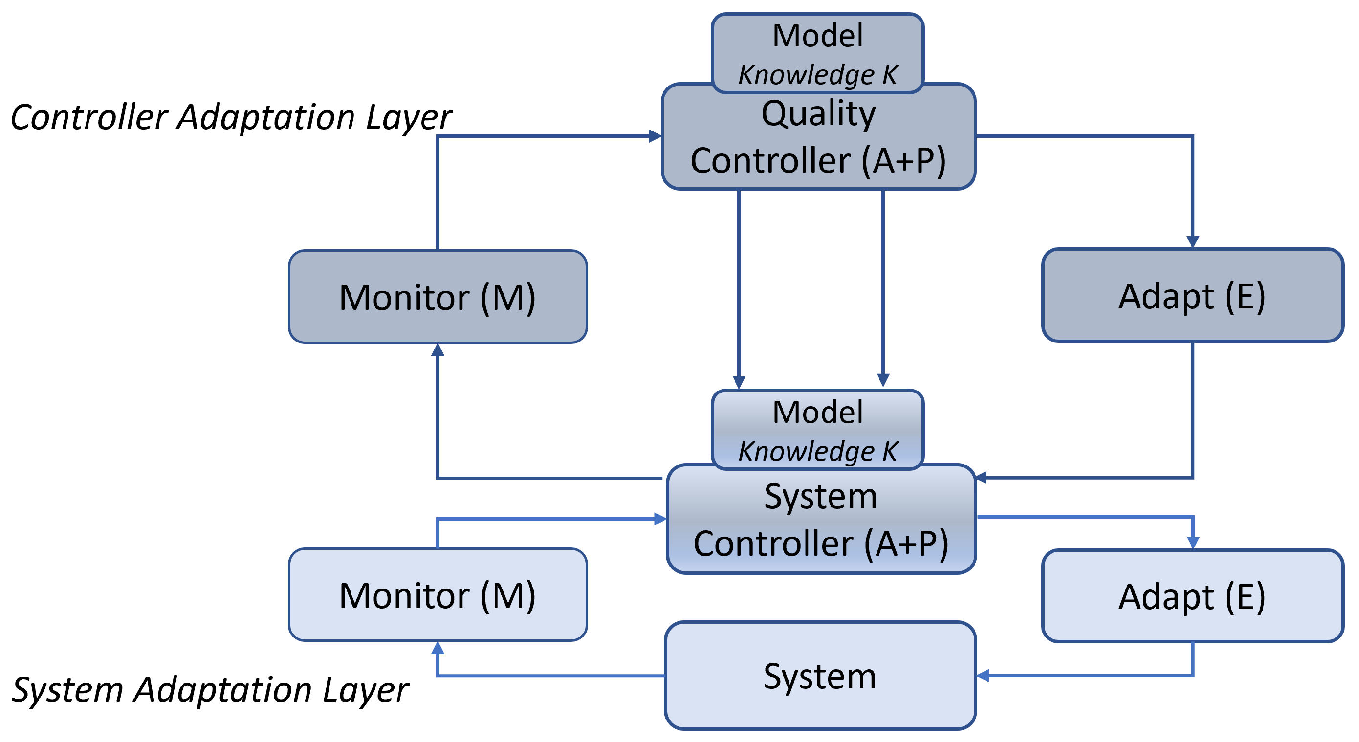 27], a three-layered reference architecture based on the MAPE-K pattern is presented that separates dynamic monitoring feedback (for managing context information for the monitoring and adaptation setting), adaptation feedback (to control the adaptive behaviour of the target system in terms of functional and non-functional properties), and objectives feedback (to control changes to the adaptation goals such as settling time or stability).