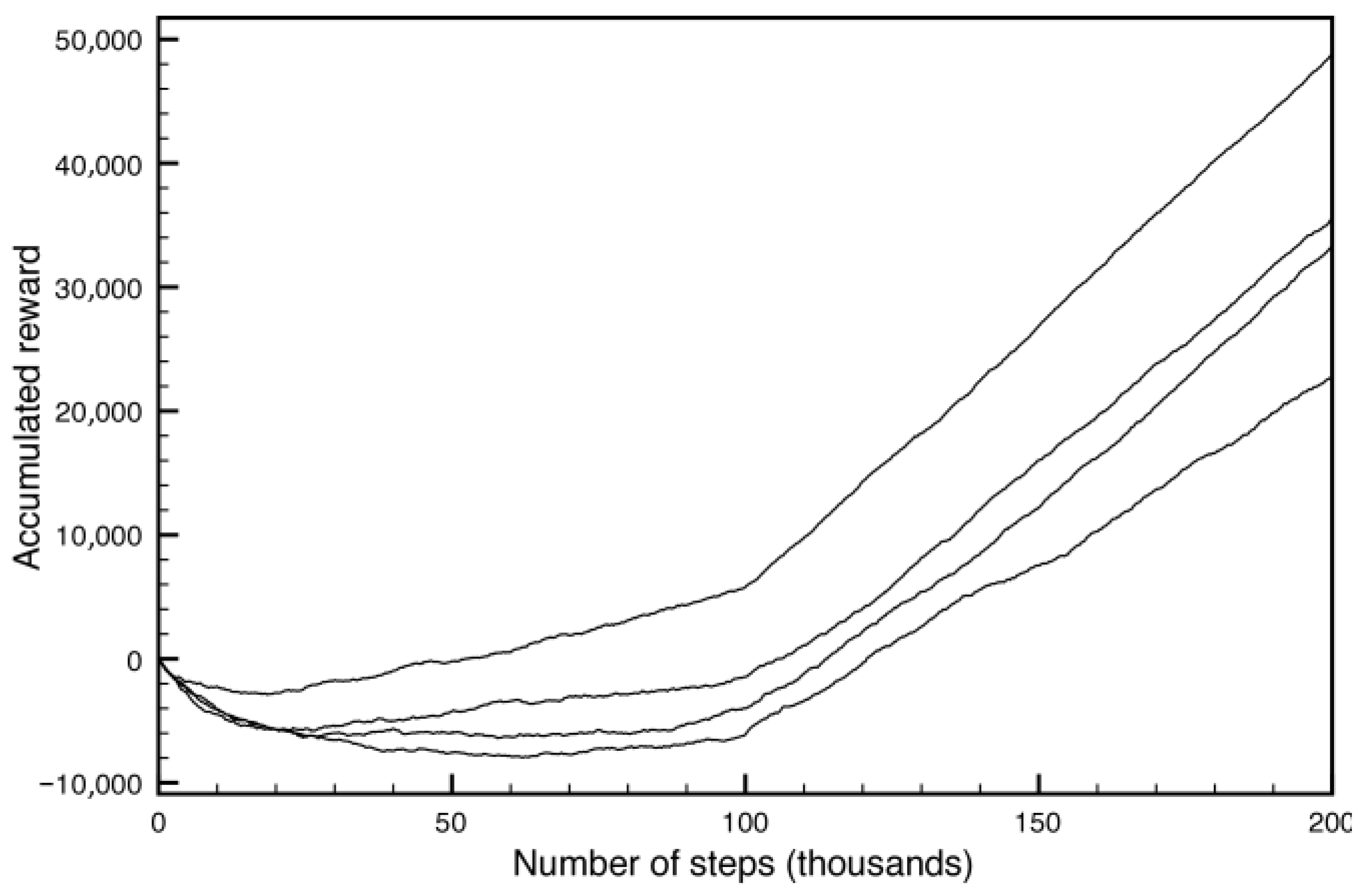 Note that the second and third cases only apply if there are positive and negative rewards. Also, note that the cumulative reward is a measure of the total reward, but algorithms such as Q-learning or SARSA use discounted rewards, modelled using the discount factor . A flattened graph would indicate that the learning process has finished with a defined policy.