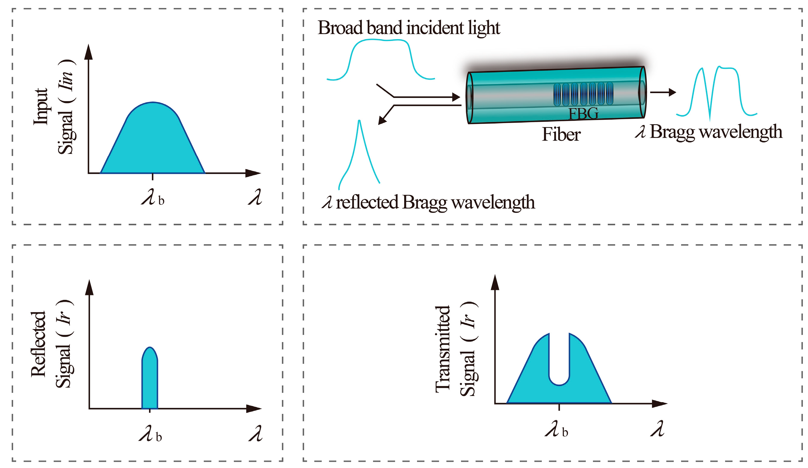 neff is the effective refractive index of the fiber core. Schematic diagrams of the FBG structure and its working principle are provided in