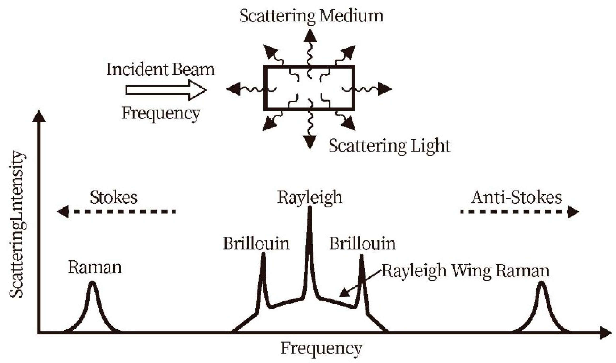 Figure 4. This figure summarizes the three main scattering processes and their frequency characteristics when light propagates through a scattering medium. In the center is Rayleigh scattering, which has the same frequency as the incident light and belongs to elastic scattering. On either side, with slightly lower or higher frequencies, is Brillouin scattering. The scattering with the largest frequency shift is Raman scattering, which includes the Stokes line (energy loss) and the anti-Stokes line (energy gain), corresponding to transitions in molecular vibrational energy levels. The entire figure clearly illustrates the spectral distribution from elastic to inelastic scattering, showing a gradual increase in frequency shift.