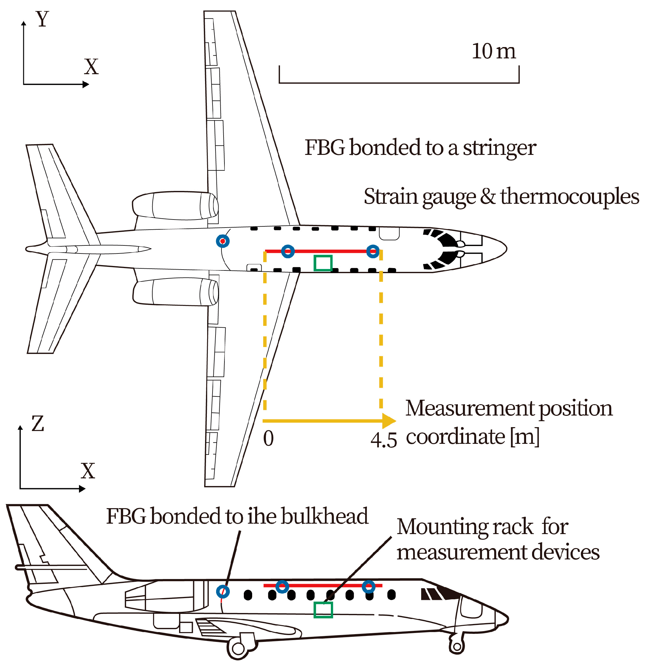 Figure 9 illustrates the configuration of the flight test bench and sensors.