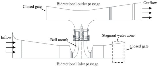The vertical bidirectional axial-flow pump enables bidirectional pumping operation through the controlled opening and closing of gate as shown in Figure 1. It is widely employed in irrigation and drainage systems along coastal and riverine areas [1,2]. However, the unique configuration of its bidirectional flow passage tends to promote the formation of large-scale vortices on the gate-closed side, resulting in a localized “stagnant water zone” [3,4]. This region not only degrades the inflow conditions to the impeller but, more critically, shifts the system’s critical stall point toward higher flow rates. Under stall conditions, the vortical structures shed from the stagnant water zone induce pronounced transient pressure pulsations [5]. These intense fluctuations are a primary driver of flow instability, component vibration, and even blade fatigue cracking. Therefore, a thorough transient analysis of vortex-induced pressure pulsations in vertical bidirectional axial-flow pumps under stall conditions—aimed at elucidating their generation mechanisms and propagation behavior—holds significant engineering and academic value for enhancing operational reliability and extending the stable operating range of this pump type.
