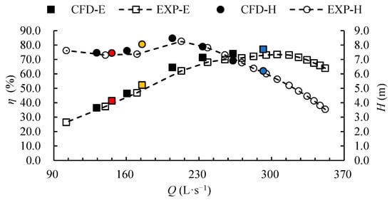 Figure 7 compares the simulated and measured characteristic curves (head and efficiency) of the bidirectional axial-flow pump. The numerical predictions align well with the experimental data. Both efficiency curves peak at the design flow rate (292 L/s). The stall region is characterized by a falling head curve with decreasing flow, where the onset and minimum head define the critical and deep stall points, respectively. The simulated critical and deep stall points occur at 0.6 Qdes and 0.5 Qdes, closely matching the corresponding experimental values of 0.58 Qdes and 0.48 Qdes. The maximum relative errors remain within 9% for head (near critical stall) and 10% for efficiency (near deep stall). These discrepancies are within typical engineering tolerances for such pump studies and are likely attributable to known limitations of the URANS approach and the SST k-ω model in strongly separated and rotating stall flows, as well as to simplifications in boundary condition setup—factors also reported in comparable works on stall analysis in axial-flow machines [33]. The agreement confirms that the mesh resolution, turbulence model, and boundary conditions are adequate for capturing the main flow features and performance trends in the present study.