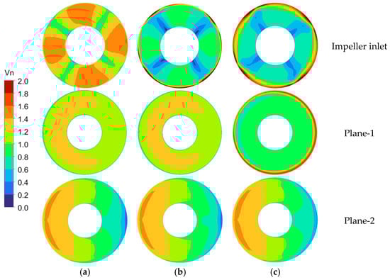 To examine the influence of the stagnant water zone on impeller inflow under various operating conditions, Figure 10 illustrates the distribution of the normalized velocity coefficient at different axial positions. The analysis indicates that in axial planes located farther from the impeller, where the pre-swirl effect is minimal, the velocity distribution exhibits typical stagnation interference characteristics—a distinct low-speed zone on one side and a high-speed zone on the other. As the observation plane approaches the impeller, the pre-swirl effect intensifies and gradually becomes the dominant mechanism, displacing the influence of the stagnant water zone. This effect drives high-speed fluid to diffuse toward the low-speed region, ultimately resulting in a nearly axisymmetric velocity profile at the impeller inlet. Notably, the onset of stall conditions modulates the degree of flow asymmetry without altering the fundamental distribution pattern. As stall develops, the increased flow resistance through the impeller particularly suppresses the transport capacity in the original high-speed zone. This suppression weakens the velocity gradient between the high-speed and stagnant regions, thereby alleviating the overall flow asymmetry while still preserving the basic spatial pattern of higher velocities near the inlet side and stagnation near the gate side.