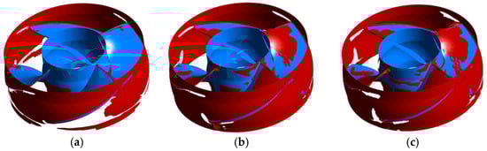 The λ2-criterion is based on the negative eigenvalues of the pressure Hessian matrix and physically corresponds to identifying regions of local pressure minima induced by rotational motion. It more rigorously excludes interference from strong shear flows and is therefore better suited for clearly identifying vortex cores within the complex shear background flow of blade passages. Figure 13 depicts the three-dimensional vortex structures within the impeller under three operating conditions, identified using the λ2-criterion. Under design conditions, the tip leakage flow generates discontinuous spiral vortices, while localized wake vortices form at the blade trailing edges. As the pump transitions into the critical stall condition, the tip leakage vortices evolve into coherent cylindrical structures, the wake vortices expand significantly, and distinct corner vortices emerge in the hub region. Under deep stall conditions, the tip leakage vortices saturate spatially, occupying the entire tip gap region. Simultaneously, the blade wake vortices extend further toward the leading edge, and the hub corner vortices propagate circumferentially. These results systematically reveal the spatial evolution of the vortex structures during the transition from design to deep stall conditions.