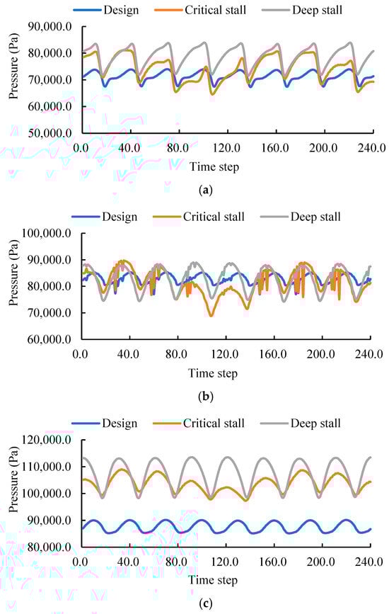 Time-domain pressure pulsations at the impeller outlet under three operating conditions: (a) point B1, (b) point B2, and (c) point B3.