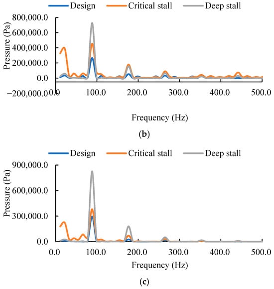 Frequency-domain pressure pulsations at the impeller outlet under three operating conditions: (a) point B1, (b) point B2, and (c) point B3.