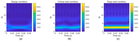 The Short-Time Fourier Transform (STFT) suffers from inherent trade-offs between temporal and spectral resolution due to its fixed analysis window. In contrast, the Continuous Wavelet Transform (CWT) employs a scalable time-frequency window, making it more effective at identifying transient events like stall inception and vortex shedding, along with tracking their frequency evolution. This adaptability renders CWT particularly suitable for analyzing non-stationary stall signals. As the highest pulsation amplitude occurs near the blade tip, Figure 19 presents the time-frequency results at monitoring point A3 under the three operating conditions based on CWT. Since the highest amplitude of the dominant frequency occurs near the blade tip region, Figure 21 presents the time–frequency distributions at monitoring point A3 under the three operating conditions. As shown, the dominant frequency bands under all three conditions are concentrated near the blade passing frequency (BPF = 4 × shaft frequency). Among them, the critical stall condition exhibits the widest frequency bandwidth and the highest amplitude. It can also be observed that under all three conditions, the dominant frequency shows a slight upward trend over time, which may be attributed to minor rotational speed fluctuations or evolving flow instabilities. Figure 22 displays the time–frequency distributions at monitoring point B3 under the three operating conditions. Compared with Figure 21, the amplitude of the dominant frequency is significantly lower. Under deep stall, however, the frequency band is the widest and its amplitude reaches the maximum. This can be explained by the large-scale, high-energy stall vortices prevailing at the impeller outlet in deep stall, which generate strong pressure fluctuations while also distributing energy over a broader frequency range due to their chaotic nature. In addition, it is evident that the dominant frequency remains stable over time without significant variation, indicating that the excitation mechanism at the impeller outlet is relatively steady compared to the leading edge region.