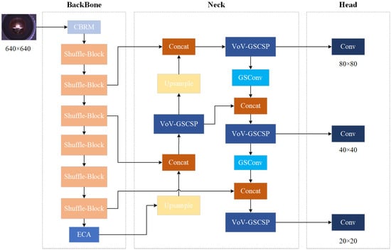 Figure 1. The input stage processes 640 × 640 pixel cup rupture images through normalization, adaptive resizing, and data augmentation. Within the backbone network, ShuffleNetV2 performs feature extraction to reduce parameters and computations. An ECA attention mechanism is incorporated at the backbone terminus to enhance recognition and extraction of cup rupture crack features. The neck section employs a Slim-Neck design, utilizing a lightweight GSConv module combined with VoV-GSCSP for feature enhancement. Finally, the detection head outputs three multi-scale prediction maps to generate final detection results.