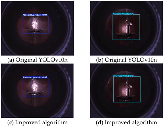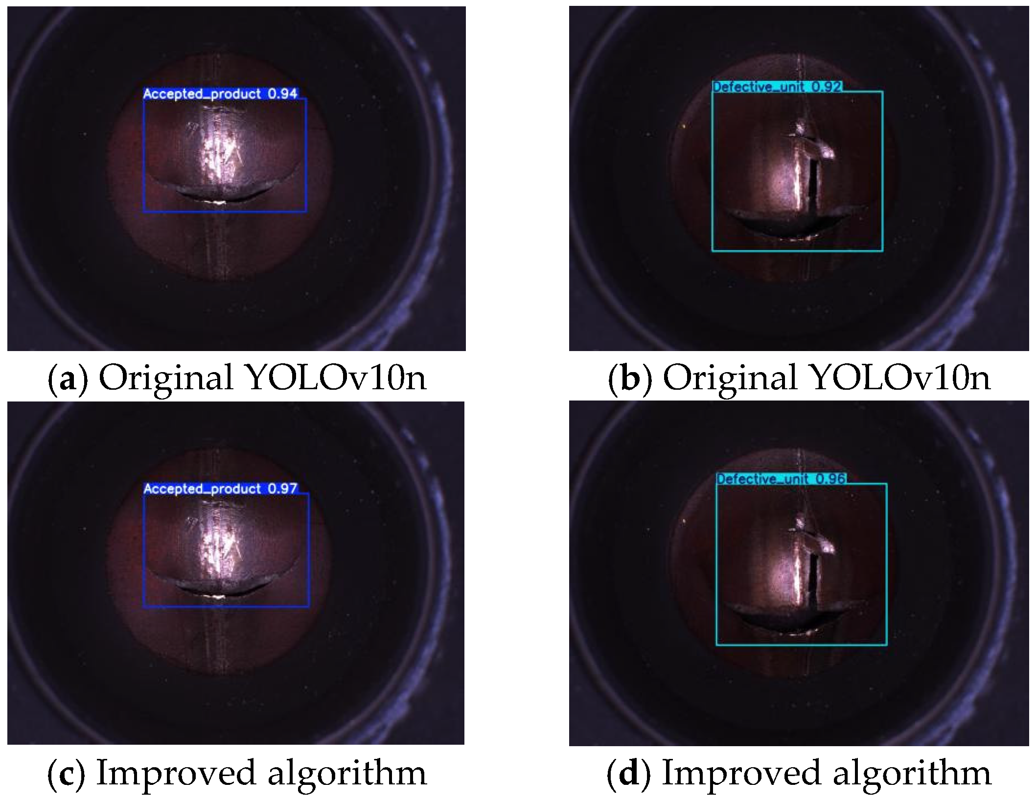 Figure 10, the improved model increases the confidence score for Accepted_product from 0.94 to 0.97 and for Defective_unit from 0.92 to 0.96, while the overall detection accuracy (mAP@0.5) is improved by 0.2 percentage points compared to the original YOLOv10n. These results confirm that the proposed scheme significantly enhances detection confidence while maintaining model lightweightness. The original model exhibited limitations in capturing edge details and associating multi-scale features, leading to an overall miss rate of 0.2 percentage points. Through enhanced edge detail capture and multi-scale feature reinforcement, the improved model effectively reduces missed detections in both Accepted_product and Defective_unit categories. The 0.2-percentage-point gain validates the necessity of the proposed improvements.