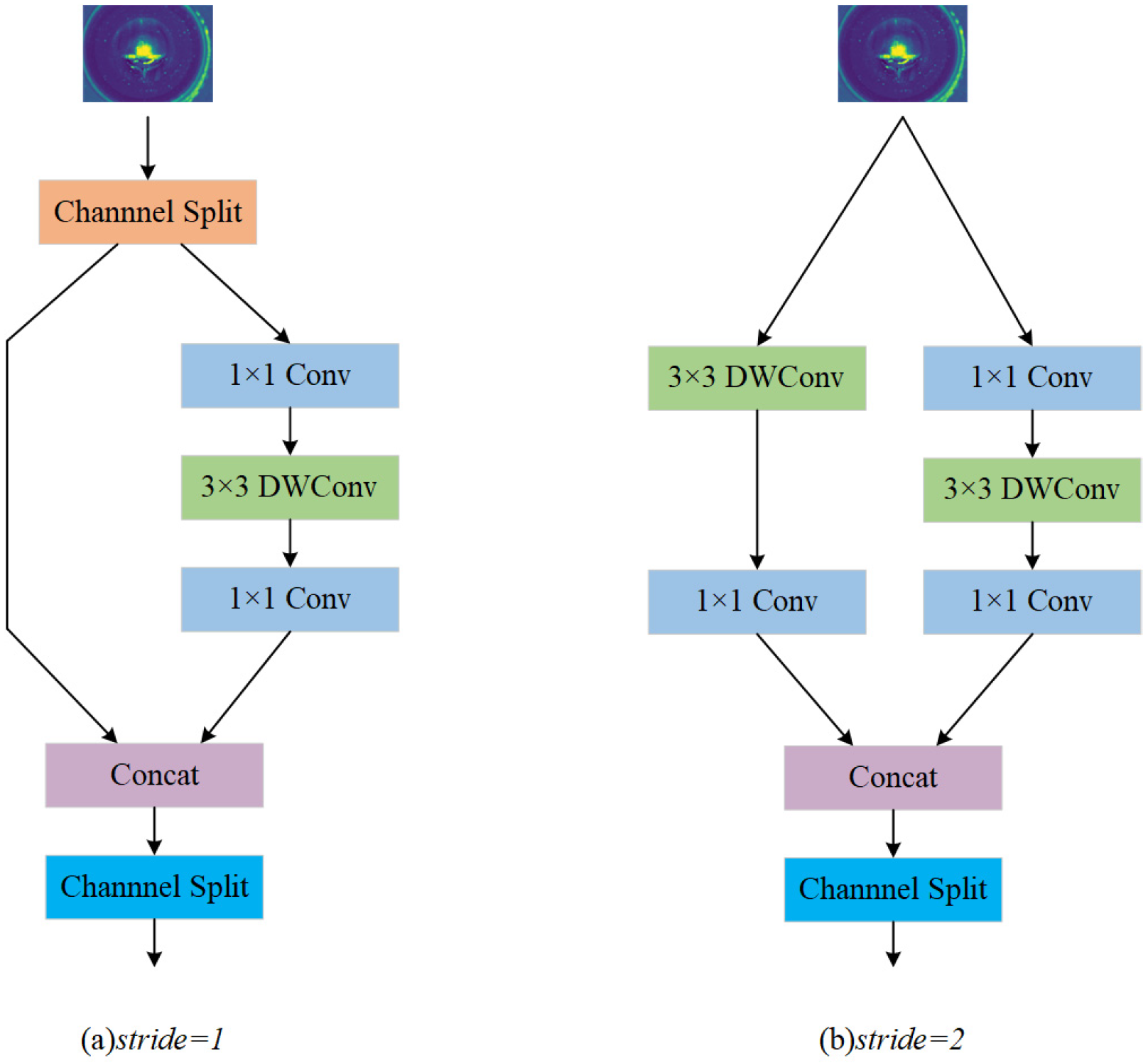 When stride = 2, spatial resolution reduction and down-sampling address field-of-view limitations in microcrack detection. Depthwise Separable Convolutions on both branches capture overall crack direction while focusing on crack tip features. Output concatenation followed by channel shuffle yields final results. These two units collectively form the ShuffleNetV2 lightweight backbone, optimizing computational efficiency and feature representation capability.