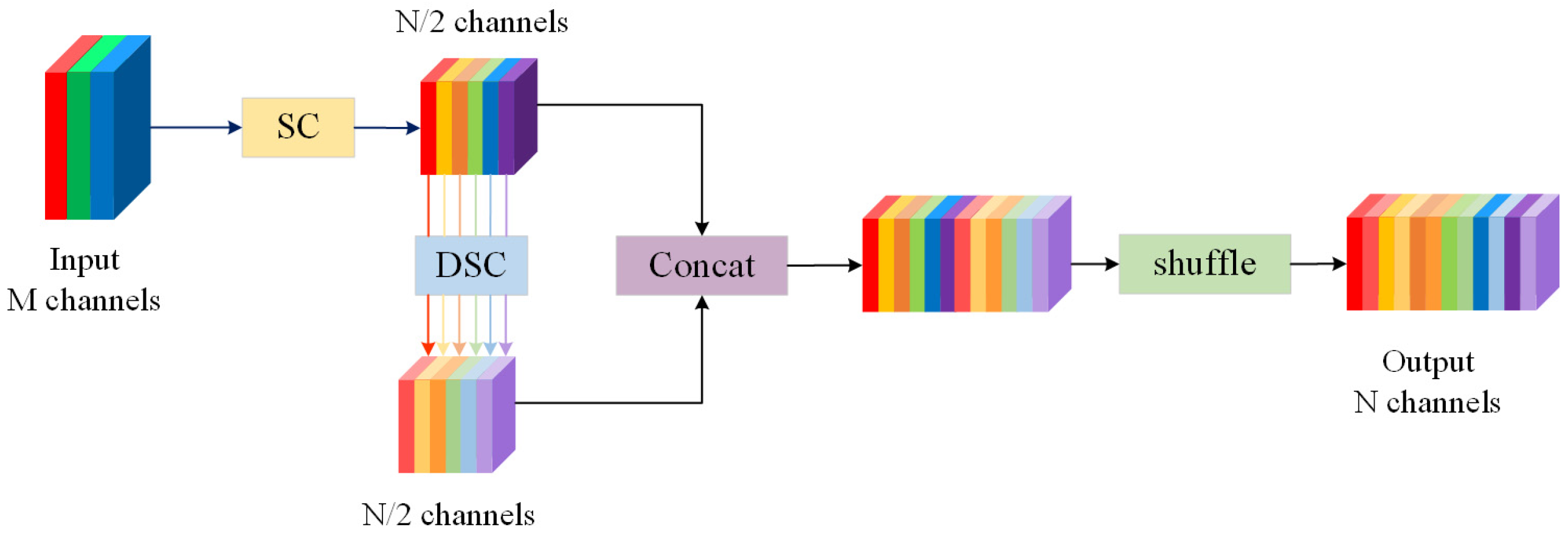27]. The GSConv execution flow comprises three sequential phases: standard convolutional dimensionality reduction, Depthwise Separable Convolution processing, and channel shuffle fusion [