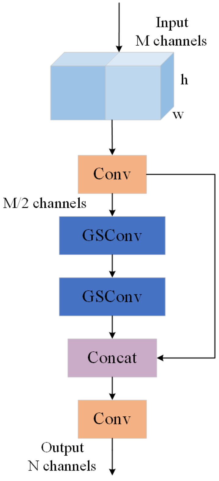 Building upon the GSConv module, Li et al. proposed the Slim-Neck design paradigm incorporating the VoV-GSCSP module to enhance detector computational cost-effectiveness. The VoV-GSCSP module constitutes a lightweight feature fusion framework based on GSConv, optimizing multi-scale feature interaction capabilities while significantly reducing computational complexity [