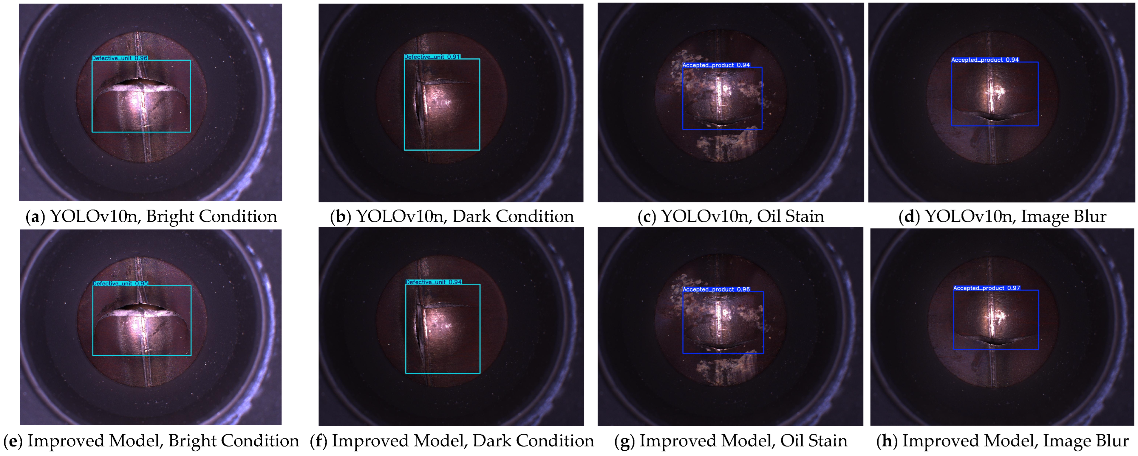 Figure 11, the improved model achieves higher mean average precision (mAP) than the original model across all challenging scenarios commonly encountered in industrial practice. This demonstrates the superior detection capability of the optimized model. In summary, the experimental results indicate that the improved model enhances detection performance under real-world industrial disturbances, exhibiting stronger robustness and better generalization ability.