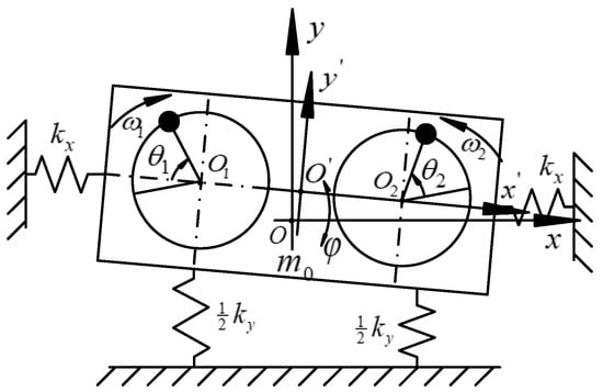 It is known from Equation (4) that there is a coupled motion term of dual excitation sources in the equation, i.e., H sin Δ τ 1 Δ τ 2 2 J i ω ̄ 2 , where, H and sin Δ τ 1 Δ τ 2 are used to describe the characteristics of the coupling effect between the two excitation sources, and the strength of the coupling is related to the structural parameters of the eccentric rotor of the excitation source itself. As shown in Figure 1, if the mass m 0 does not have elastic support, then k x = k y = 0 , and the system in Figure 1 has no vibration motion. At this point, H = 0 in Equation (5) indicates that there will be no mutual coupling between the excitation sources in the coupling equation of Equation (4), and the two excitation sources will move independently.