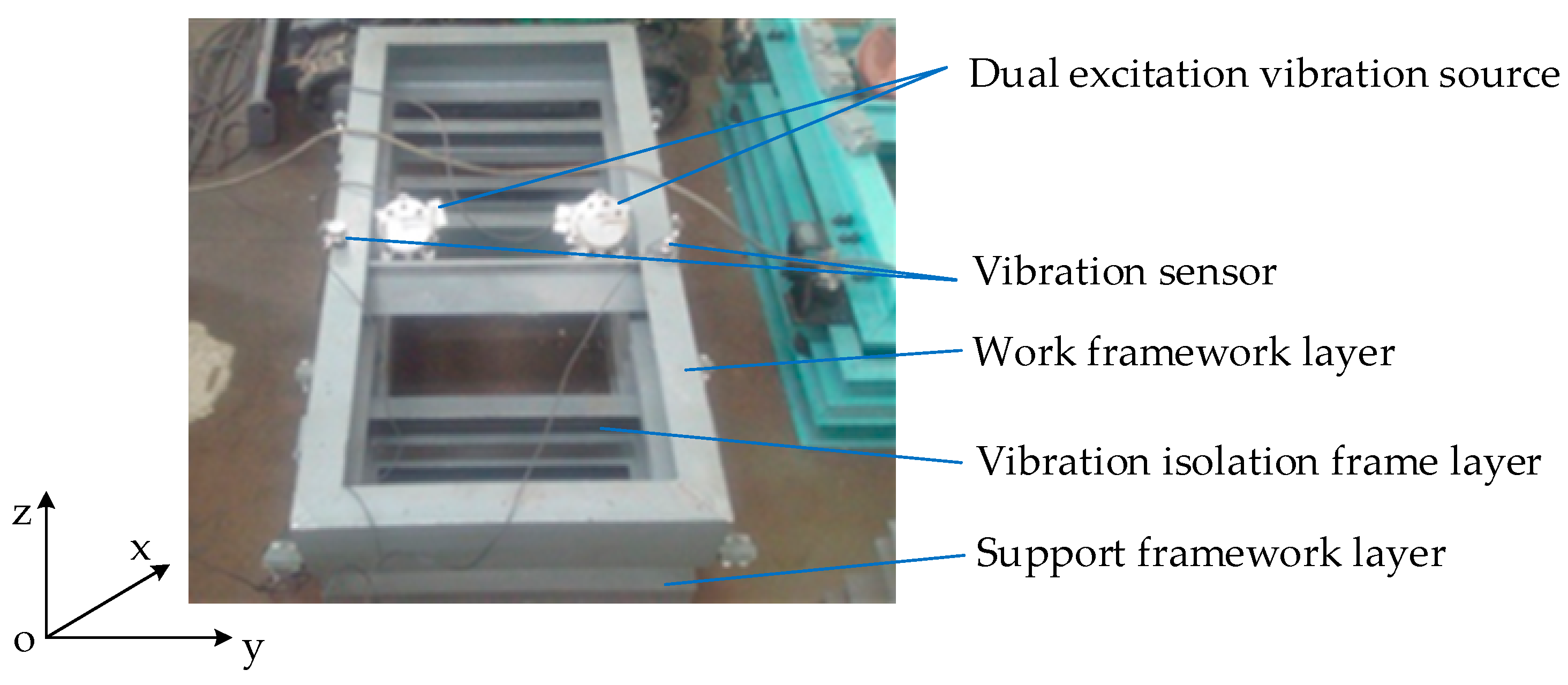As shown in Figure 2, the scaled-down prototype of the dual-excitation-source mining screen consists of three layers of frame beams. The work framework layer is constructed with 16A# (160 × 63 × 6.5 mm) channel steel. The frame beam (2560 × 640 × 160 mm) is connected to the vibration-isolation frame layer (2560 × 640 × 80 mm) via primary vibration springs, while the vibration-isolation frame layer is linked to the support framework layer (2560 × 640 × 50 mm) fixed on the platform through helical support springs. Figure 2 shows that the prototype employs two excitation vibration sources operating in reverse synchronization to excite the work framework layer (with a dual excitation motor frequency bandwidth of 0–150 Hz). The frame beam is a two-degree-of-freedom system in both horizontal and vertical directions. Two vibration sensors (model: 4801A, Sensitivity: 1000 mV/g, Supplier: Sensor Way Measurement and Control Technology Co., Ltd., Beijing, China) are installed on the layer to be tested for measuring the vibration response of the ore sieve size reduction prototype [14].