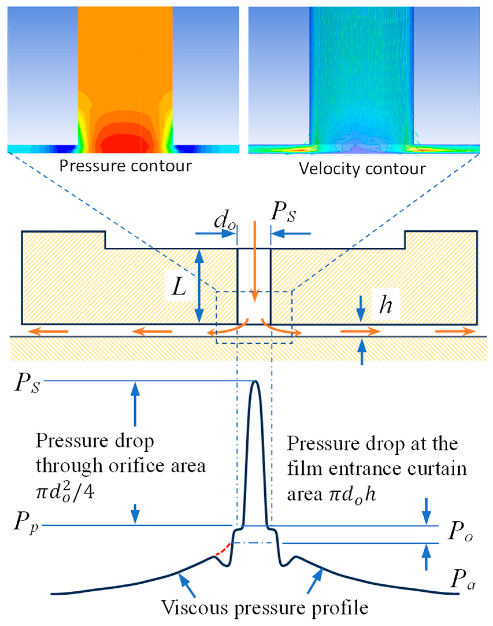 - Perform CFD simulations on a simple geometry, e.g., circular centrally fed air bearing pad, to obtain mass flow rate and load W at different film thickness h, orifice diameter do, and orifice length-to-diameter ratio L/do.