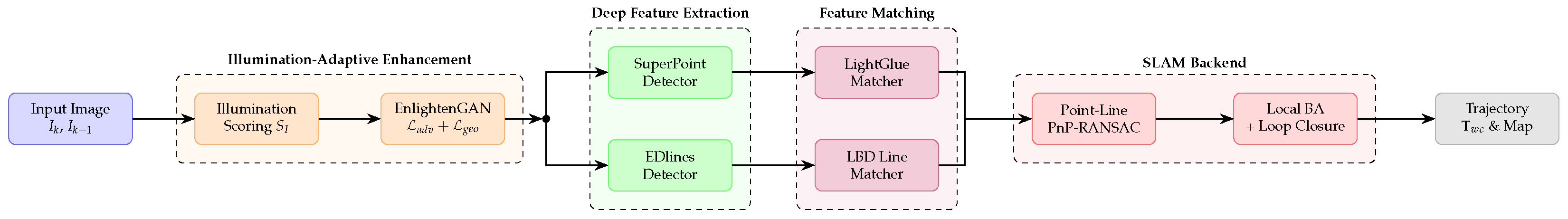 - Zhao, Z.; Wu, C.; Kong, X.; Li, Q.; Guo, Z.; Lv, Z. Light-SLAM: A robust deep-learning visual SLAM system based on LightGlue under challenging lighting conditions. IEEE Trans. Intell. Transp. Syst. 2025, 26, 9918–9931. [Google Scholar] [CrossRef]