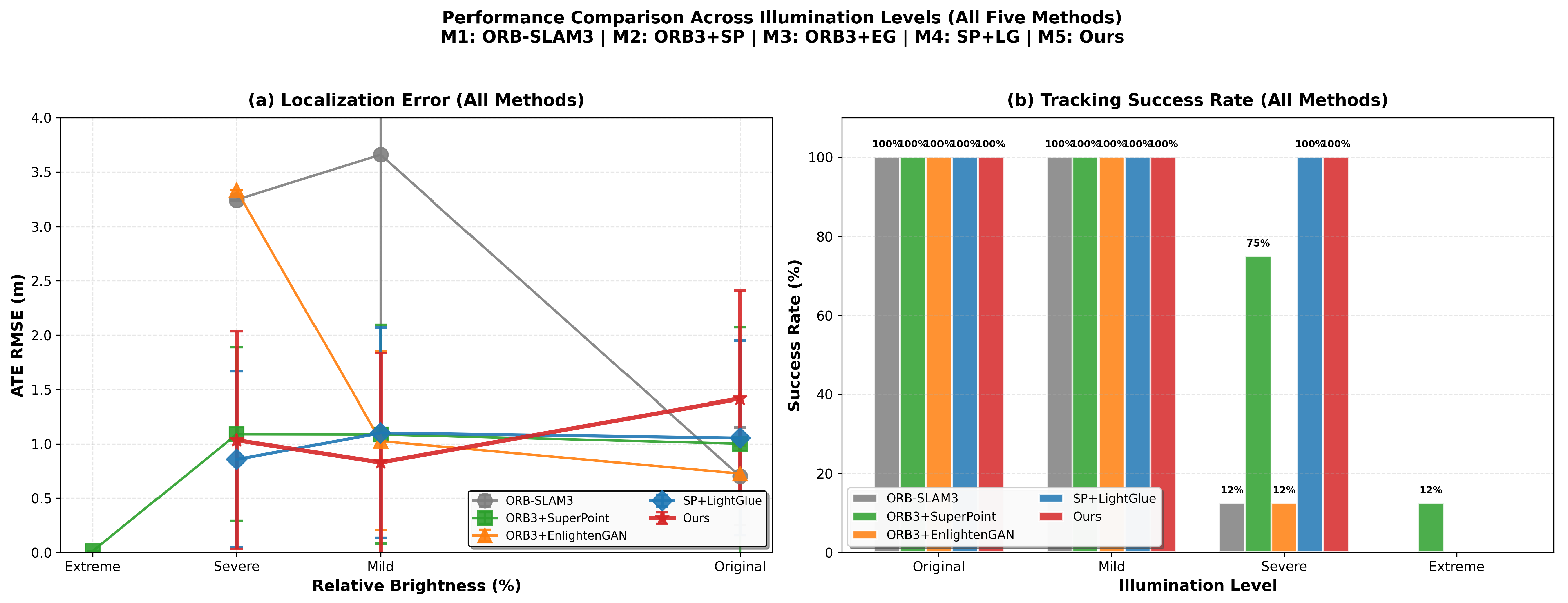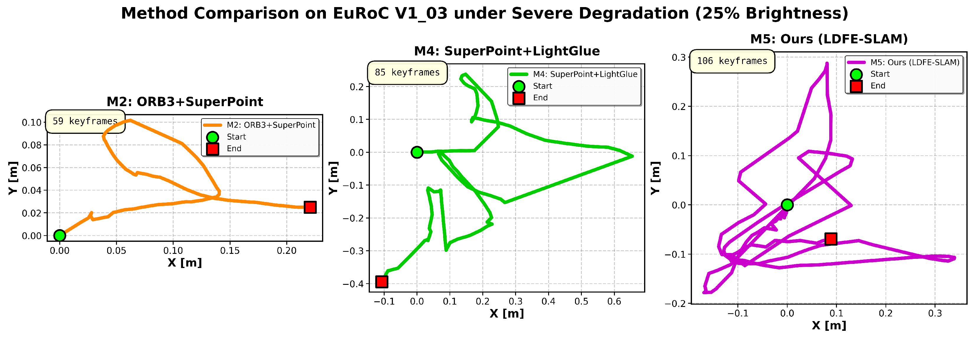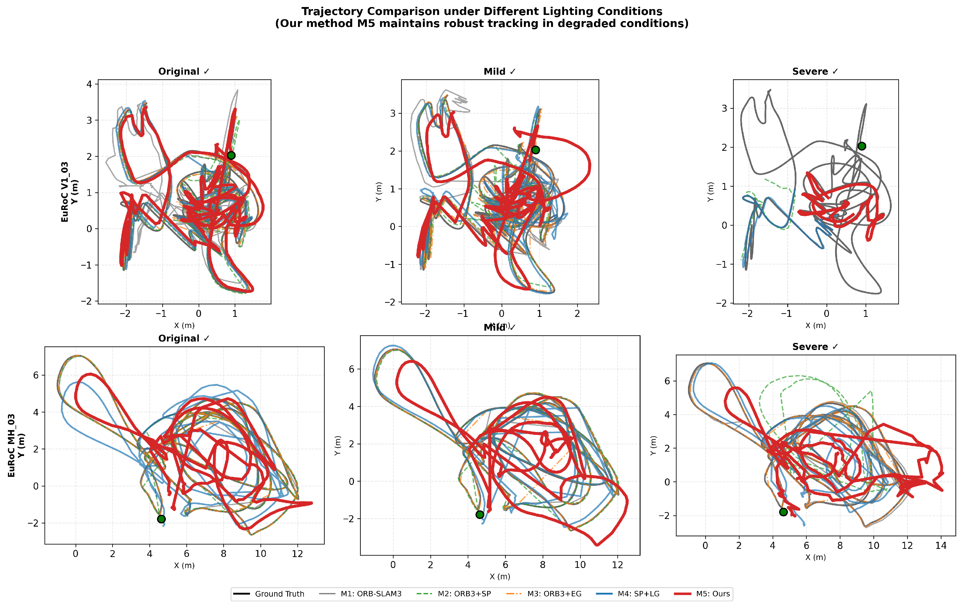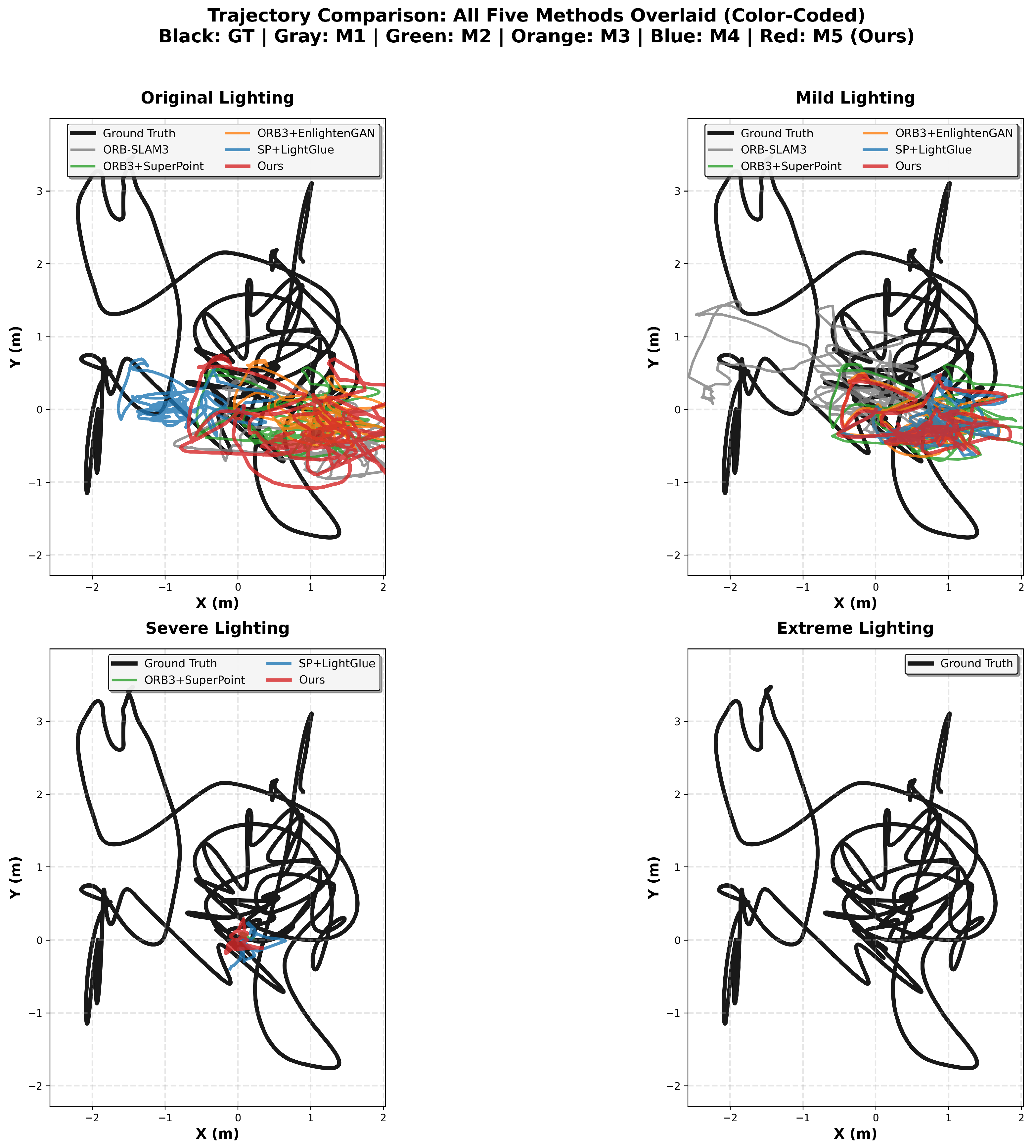 - M5 (Ours): Complete LDFE-SLAM integrating EnlightenGAN enhancement with SuperPoint and LightGlue.
