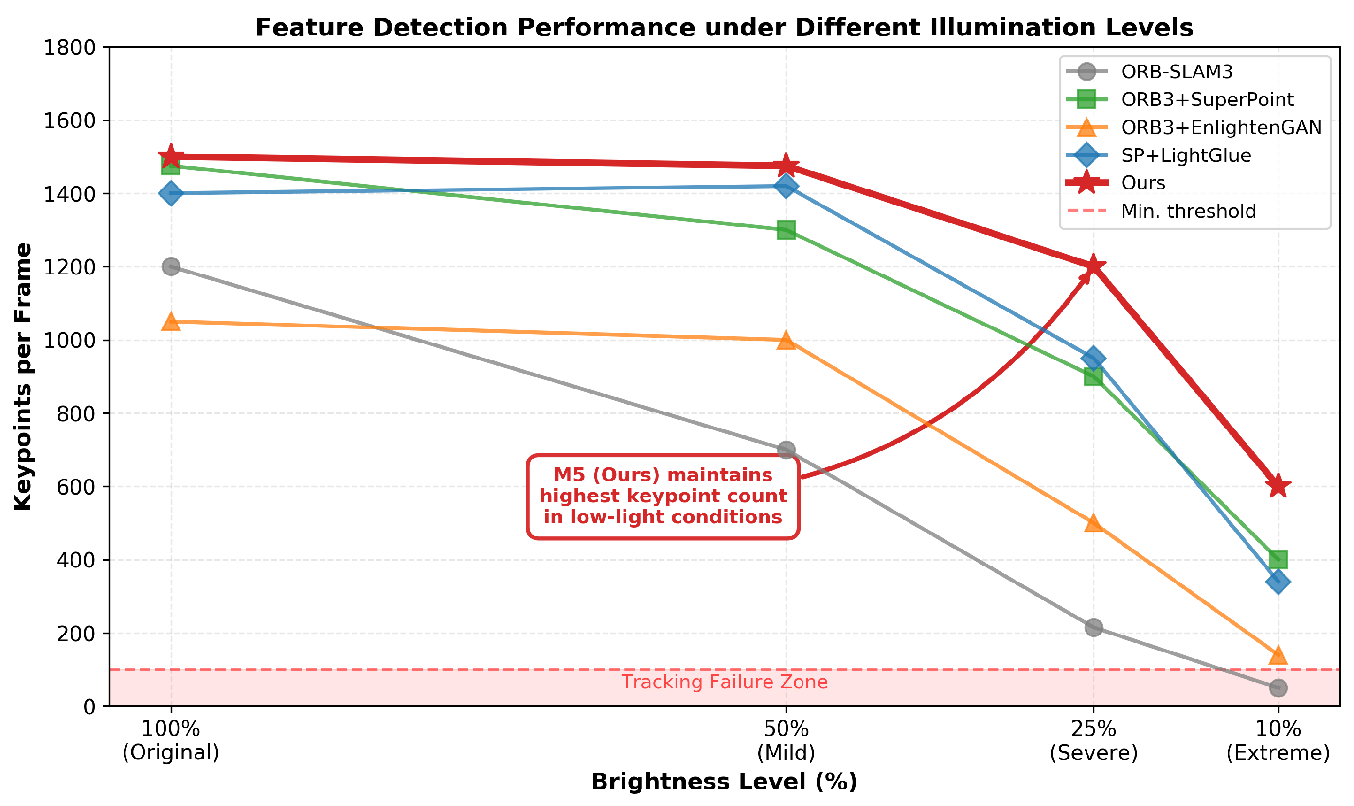 - Under severe (25%) brightness, M1 drops to ∼200 keypoints (near the failure threshold), while M5 maintains ∼1200 keypoints.