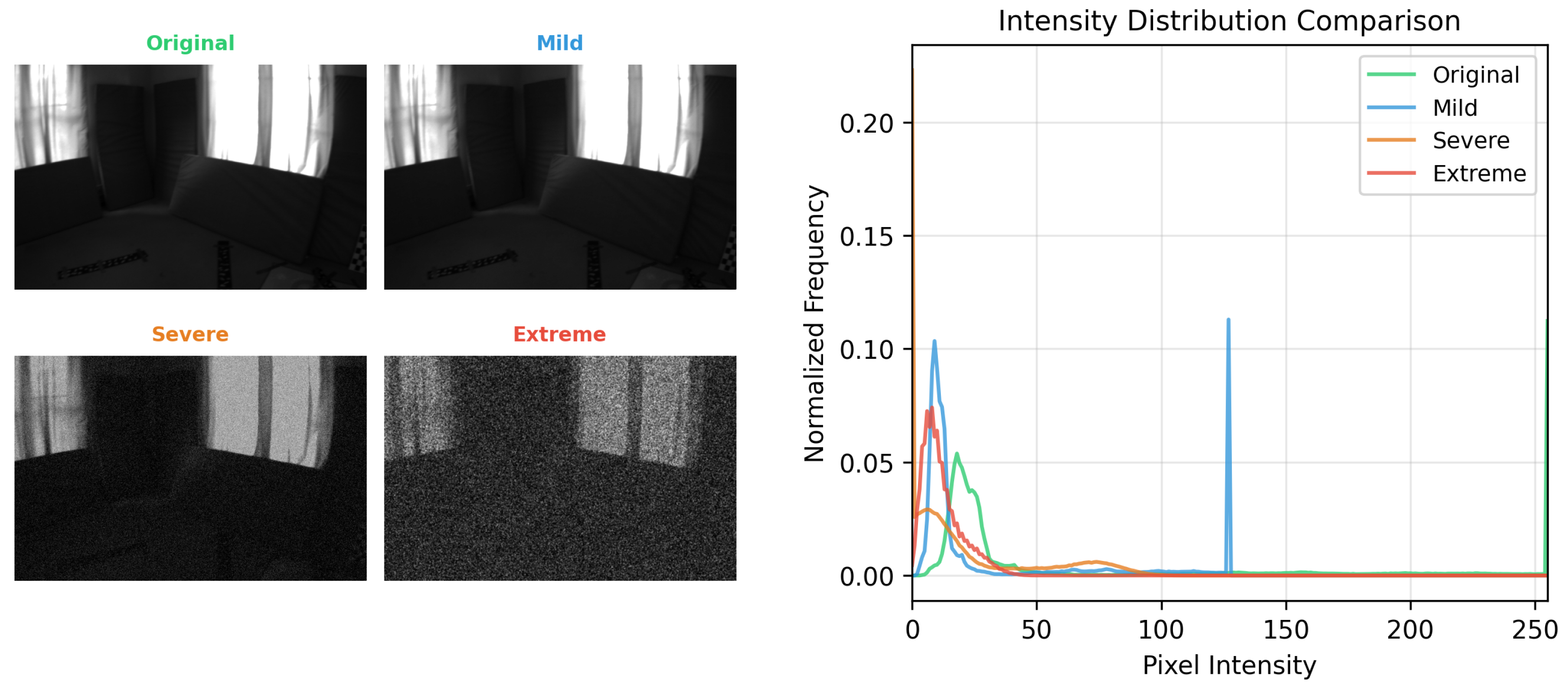 - Raw low-light images: Features cluster in bright regions, leaving 60% of the image area without coverage.