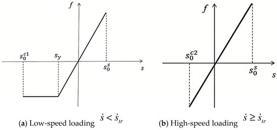 The PD force density function applied to the hailstone in this study includes the following typical mechanical properties of ice: (1) ductile–brittle behavior under fast compressive loading; (2) ductile behavior under slow compressive loading; (3) ductile–brittle behavior under tensile loading at any rate; and (4) different tensile and compressive strengths. The force density function for hailstone ice is shown in Figure 1.