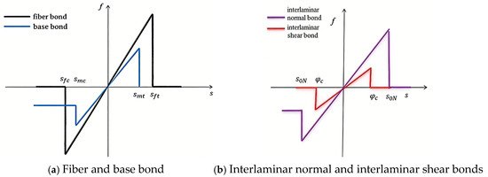 In Figure 2, and represent the critical elongations of the fiber bonds under tension and compression, respectively; and denote the critical elongations of matrix bonds under tension and compression, respectively; indicates the critical elongation of the interlaminar normal bond, while signifies the critical shear angle of the interlaminar shear bond.