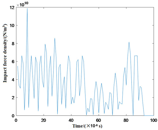 To determine the damage to the laminate resulting from the impact force, we selected the material point located at the center of the top layer (coordinates 0, 0, 0.035, as shown in Figure 4) as our focal point for establishing the temporal variation in impact force density, depicted in Figure 6. During the initial phase of impact, the impact force density reached its maximum value within a very short time frame before decreasing to a certain value and subsequently fluctuating constantly. The early maximum impact force density can be attributed to the initial collision of hailstone particles against the plate, which are continuously compressed by the remaining hailstone behind them, resulting in high pressure at the center of the hailstone face. During the intermediate stage of impact, the density of the impact force decreased to a minimum before gradually increasing to reach a local peak value. In the later stage of impact, the impact force density rapidly diminished to zero.