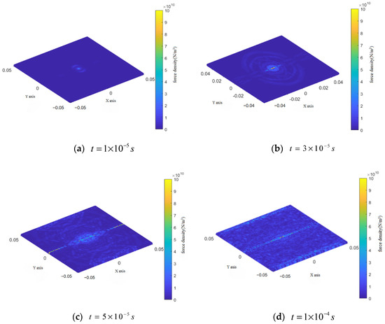 The force densities in the top layer of the composite laminate during impact are shown in Figure 7. This figure reveals that the impact area itself exhibited the highest force density in a circular shape. Additionally, it clearly demonstrates propagation of stress waves within the top layer during impact, with the point of contact serving as the center of this circular pattern and stress radiating outward. Wave rebound and interference occurred when the stress wave diffused to the fixed support boundary. Due to the higher Young’s modulus in the direction of the composite fibers compared to other directions, the propagation velocity of the stress wave along the fiber axis is significantly greater, resulting in an increased force density at the impact location and a pronounced spindle formation aligned with the fiber direction of the top layer. The fiber orientation is designated as direction X in Figure 7.
