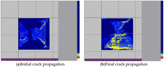 After determining , the corresponding transition of the force density function model can be controlled. When is less than a certain value, the force density function acts according to a ductile model; when reaches or exceeds this value, the force density function acts according to the brittle model. In this study, the value of which the ductile–brittle transition occurs is designated as the ductile–brittle transition point . Hailstone ice is considered ductile when and brittle when .