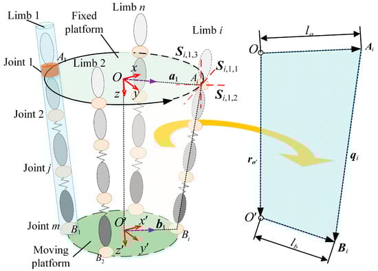 As illustrated in the general schematic diagram of the structure, each endpoint Ai, Bi (where i = 1, 2, …, n) in the kinematic limb forms a set of closed-loop vector equations with points O and .