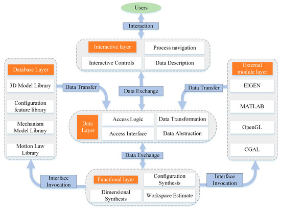 To facilitate systematic configuration design, kinematic analysis and dimensional synthesis of various parallel robotic systems, a hierarchical digital toolbox architecture has been developed as illustrated in Figure 3. The framework comprises five functionally distinct strata: Interactive Layer, Data Layer, External Module Layer, Database Layer and Functional Layer, each characterized as follows.