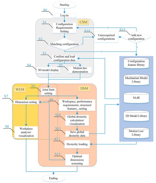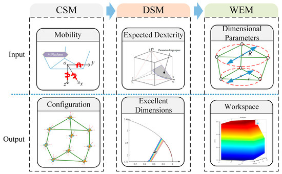 As illustrated in Figure 4, three core computational modules—Configuration Synthesis Module (CSM), Workspace Estimation Module (WEM), and Dimension Synthesis Module (DSM)—are developed to establish bi-directional mappings between the topological parameters of parallel robots and their kinematic performance metrics. These modules enable systematic determination of dexterity indices and workspace characteristics through configuration-dependent analysis, as detailed below.