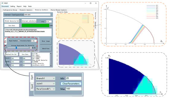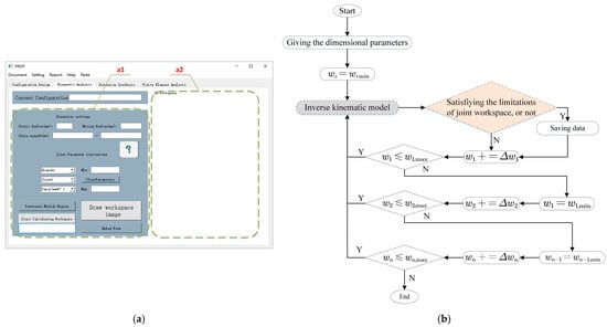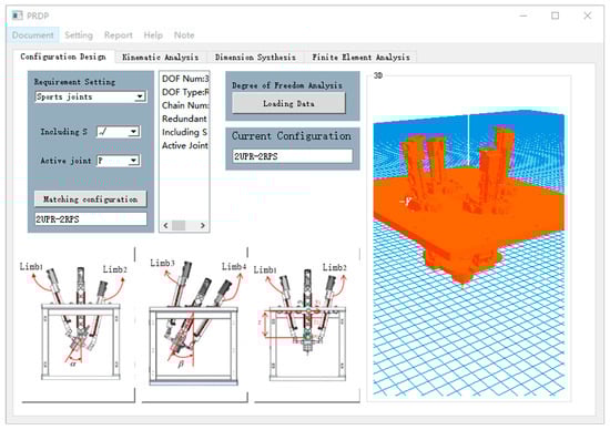 Many research institutions have contributed to digitizing the design process of parallel robots. G. Bianchi et al. [21] pioneered an integrated rapid design software for parallel mechanisms that combines structural design, numerical computation, finite element analysis and remote monitoring software. The developed VPE-PKM platform integrates fundamental theoretical knowledge of robot design and allows for reachable workspace estimation, Jacobian matrix calculation, stiffness estimation and elastic mechanics analysis. The platform represents a significant step towards comprehensive design tools for parallel robots. However, its current focus on 3-DOF parallel robots limits its applicability to a narrow range of designs. Ding’s team [22,23,24] developed automated configuration sketching techniques, culminating in a 5-DOF parallel mechanism synthesis toolbox that employs standardized limb decomposition into rotational/translational joint combinations, enabling intuitive configuration retrieval and visualization. Wang et al. [25] introduced an analysis feature model aimed at the integration of commercial CAD and CAE software. By employing feature mapping, this model automatically converts analytical features into script codes for finite element analysis (FEA), enabling structural optimization of machine tools. Additionally, Zhang et al. [26,27] utilized Java and Java3D to develop a suite of virtual design toolboxes tailored for tripod-like parallel mechanisms. These toolboxes include functionalities for analyzing the dynamic performance of 3-DOF kinematics, dynamics analysis, statics optimization and structural optimization. Rega et al. [28] proposed a method for modeling and virtually testing complex machine tools. They integrated the kinematic inverse solution of the P800 parallel machine tool into a secondary developed CAD toolbox to simulate the testing trajectory of the machine tool. Kocak et al. [29] focused on a user-friendly graphical user interface (GUI) for the structural synthesis of parallel manipulators. They utilized distinct mobility formulations, introduced variable constrained loops and showcased the design toolbox of single-platform manipulators with the capacity for scalability to multi-platform configurations.