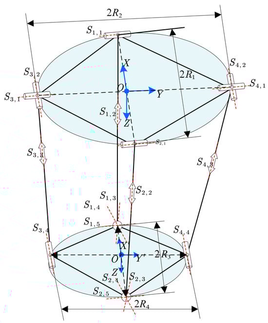 The end-effector’s twist vector combines angular velocity and linear velocity at the moving platform’s centroid. On the ith limb, represents the movable screw of the jth joint, while represents the immovable screw of the jrth joint. The moving platform’s resultant twist derives from limb contributions: