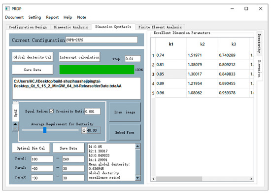Furthermore, the global dexterity graph for the current stage is generated, as depicted in Figure 12. Referring to the declining trend of mean dexterity in Figure 12, the global dexterity lower limit is set to 0.4 with the structural feature of equal radii for the moving and fixed platforms. The digital toolbox then filters dimensions meeting this criterion and displays the results in Figure 13.