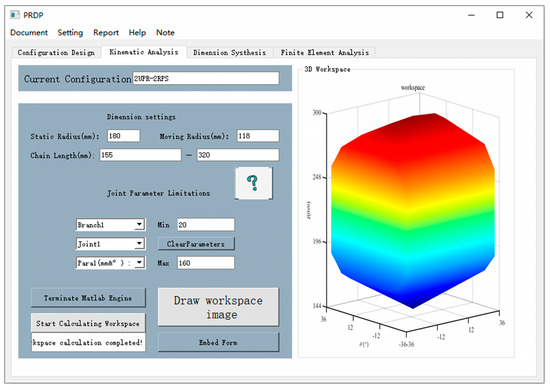 Following configuration validation, the system synchronizes the Workspace Estimation Module (WEM) and DSM with the newly added model. With fixed platform installation dimensions constrained, users configure R2 = 180 mm while importing prescribed workspace boundaries and joint mobility ranges from Table 3 into Phases S6 and S9. The global dexterity dataset is subsequently archived in .txt format, adhering to the parameter indexing convention Pi,j,k, which mirrors the structural nomenclature Si,j,k.