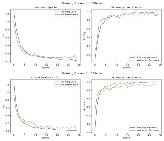 Training vs. Validation Loss and accuracy curves for both 520 rpm and 635 rpm datasets.